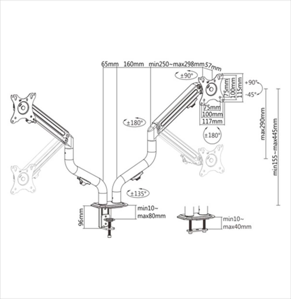 - Suggested desktop thickness: Clamp: 10 ~ 80 mm, grommet: 10 ~ 40 mm